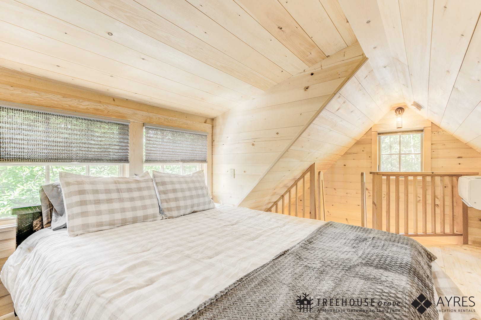 The open-concept design features a tiny-home kitchen with essential appliances, a cozy living area with a pull-out leather sofa, and a queen bedroom with a custom-built bedframe. The loft, accessible by a ladder, provides an additional queen bed, creating a tranquil space to sleep under vaulted ceilings crafted from Western Red Cedar. Outside, the screened-in dining porch offers a panoramic view of the Smokies, seating up to six for shared meals in the fresh mountain air.
