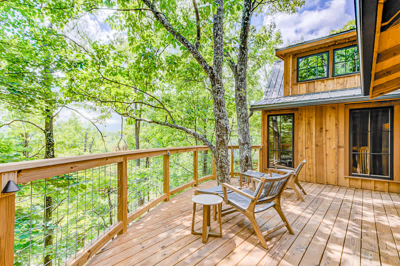 On the main level of the treehouse pod, you will find a coffee station including a mini-fridge, coffee machine, eco-friendly utensils & dishware! You can find 2 bedrooms, one accessed via a ladder to a loft, with queen beds. In addition, you have a private bathroom with a walk-in shower. Within your treehouse pod, there are tons of windows so you can enjoy the scenic views of the Smoky Mountains! You’ll also have access to a large platform deck with a covered dining area fit with 8 chairs – perfect for dining outside!