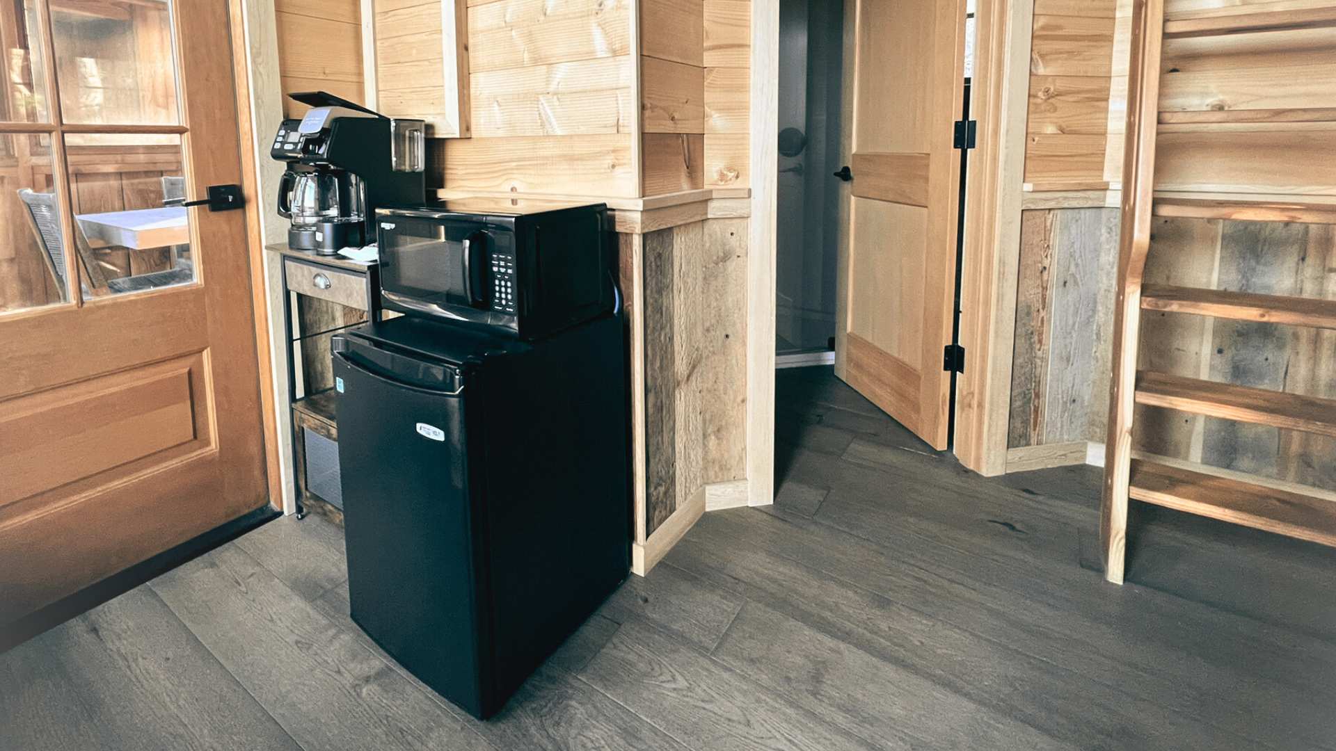 Main Level: 1 Queen Bed, 1 Private Bathroom with a Walk-In Shower, and 1 Coffee Station with a Mini-Fridge & Coffee Machine (Eco-friendly, disposable utensils & plates included!)