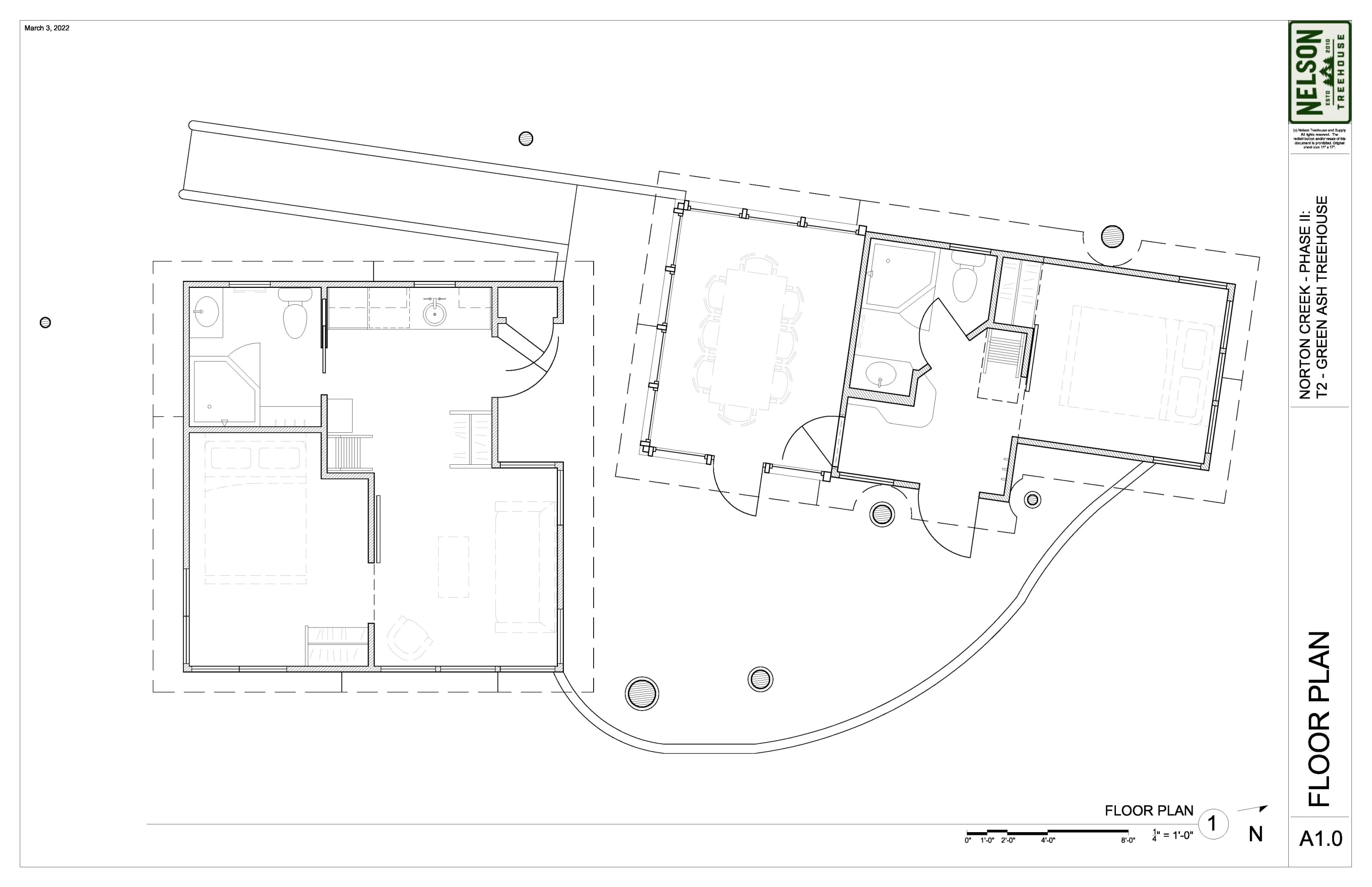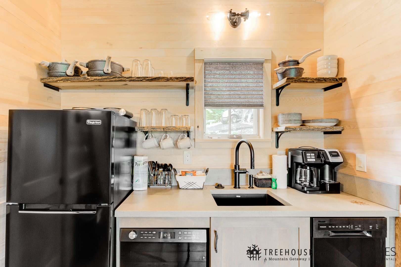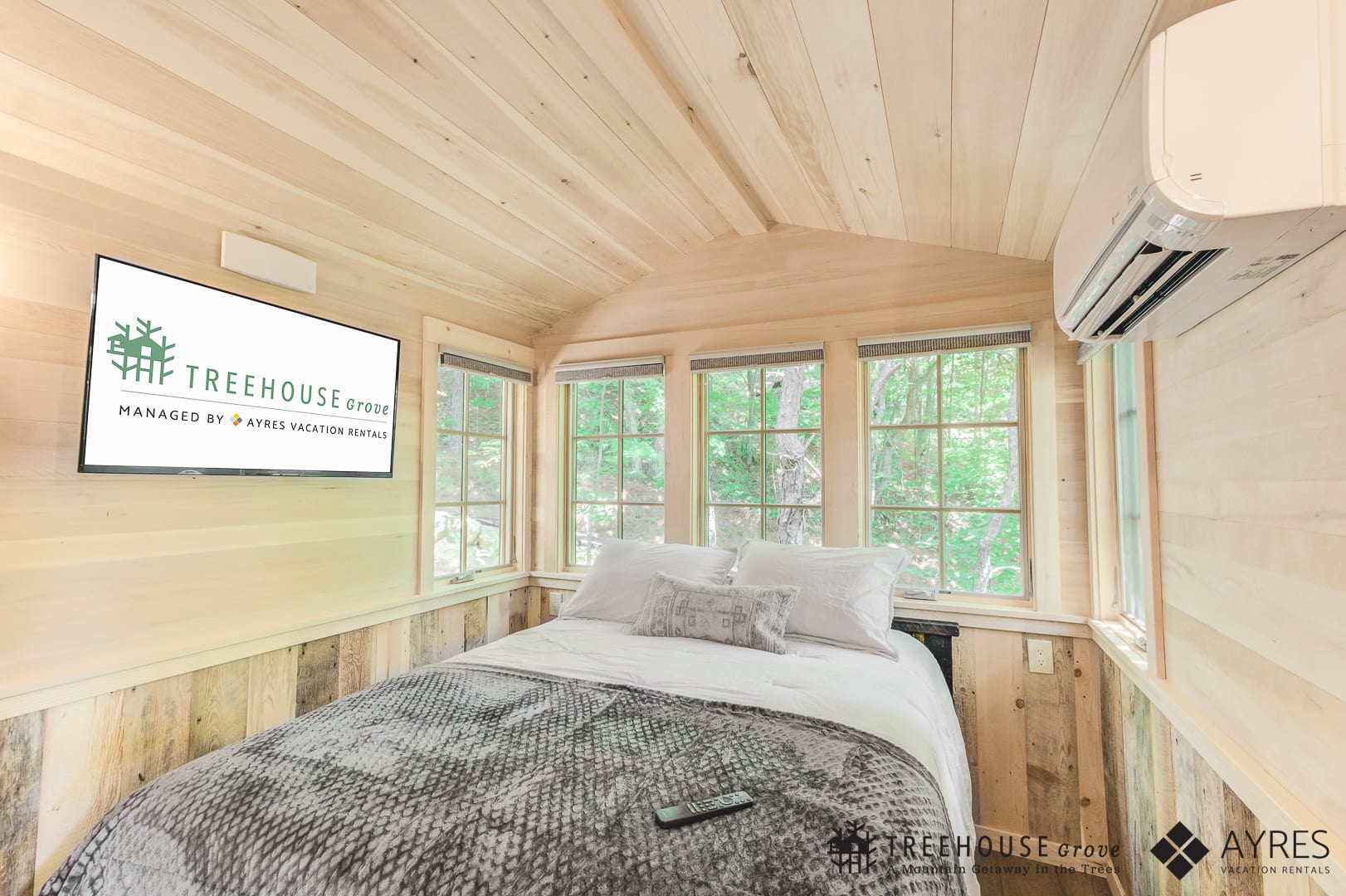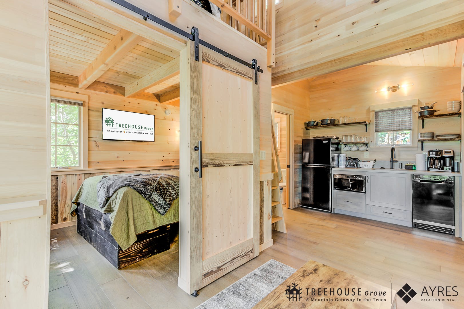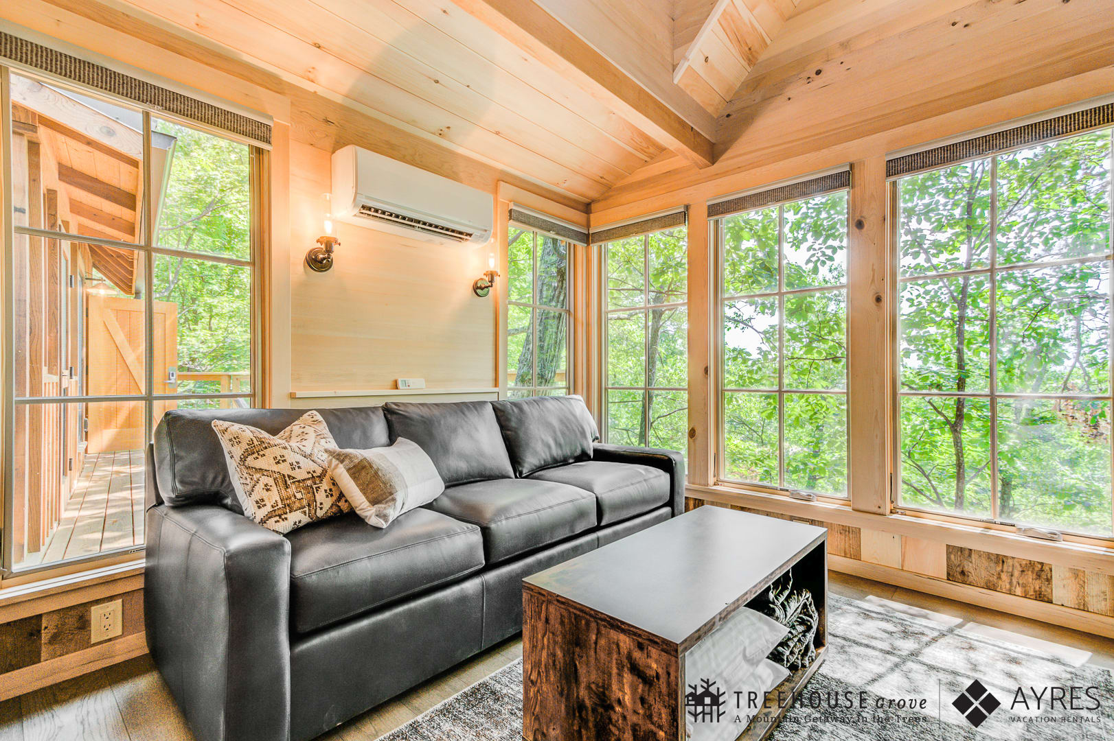 The Green Ash Treehouse features a unique layout with two separate pods designed for privacy and functionality. The Main Pod includes a queen bedroom, a lofted queen bed, a living area with a custom leather pullout couch, and a well-equipped kitchenette. The Guest Pod offers a tranquil retreat with a master bedroom, full bathroom, and an additional lofted queen bed, making it perfect for families or groups seeking both togetherness and personal space.