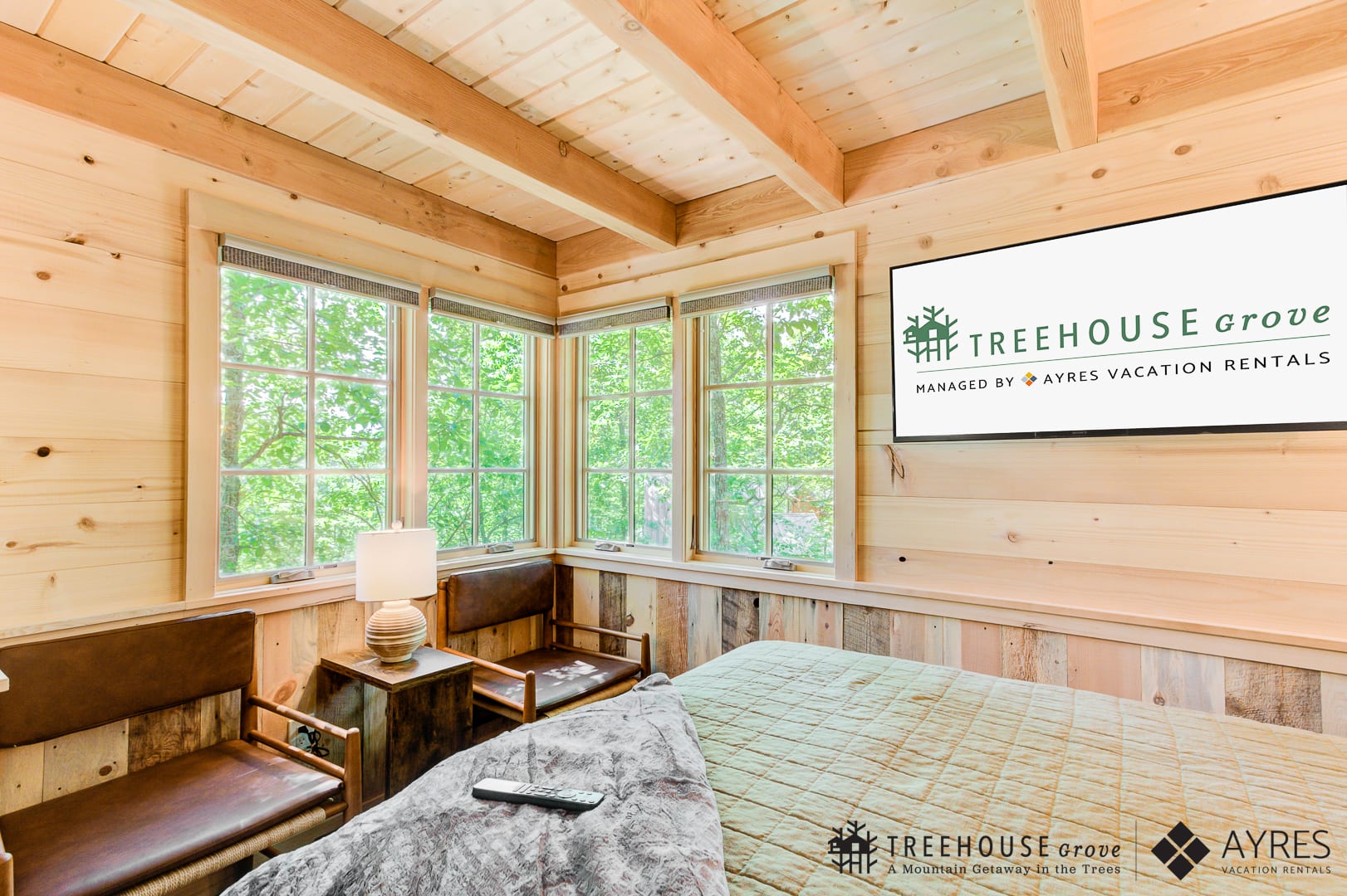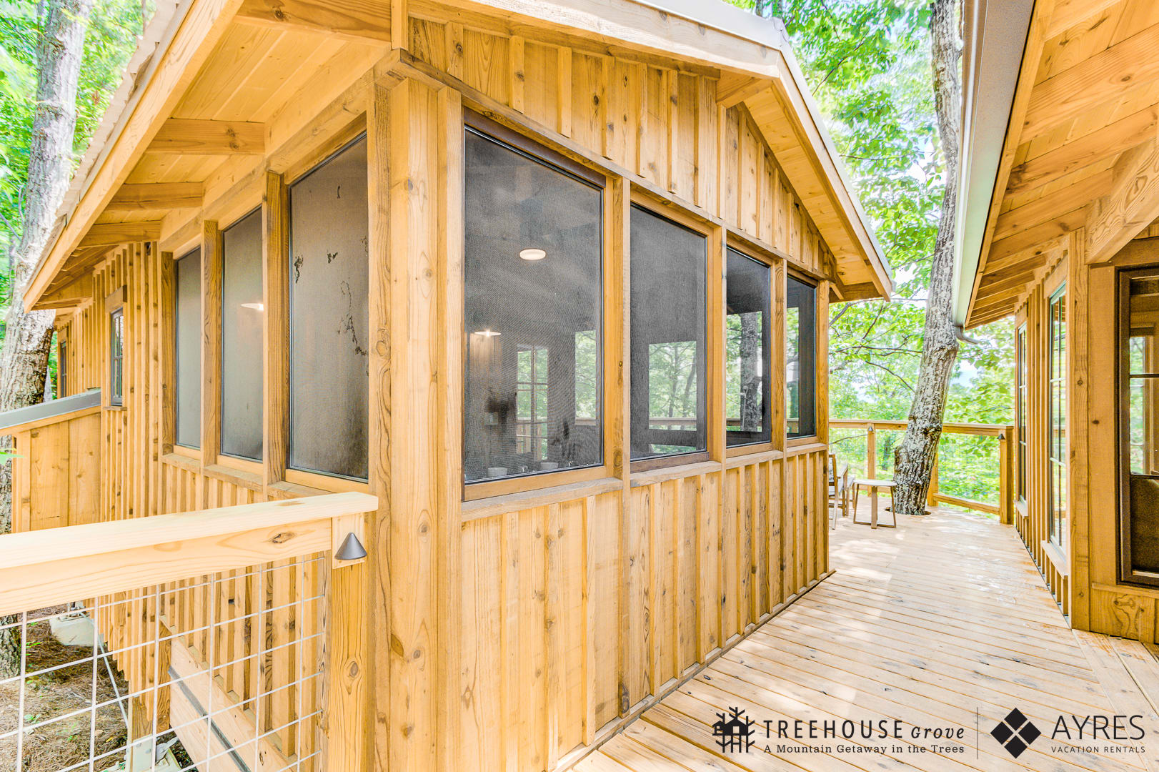 The Green Ash treehouse comfortably accommodates 8 guests (10 with pullout couch), making it ideal for families and groups. Designed with both comfort and craftsmanship in mind, this treehouse features two queen bedrooms, two lofted queen beds, and a leather sleeper sofa in the living area. Built with premium materials, it includes features like reclaimed pine wainscot, Western Red Cedar siding, and a screened porch on the oversized deck with ample seating for everyone to enjoy meals together. Enter from the convenient paved parking area, and be greeted by panoramic mountain views and the natural beauty of the Smokies.