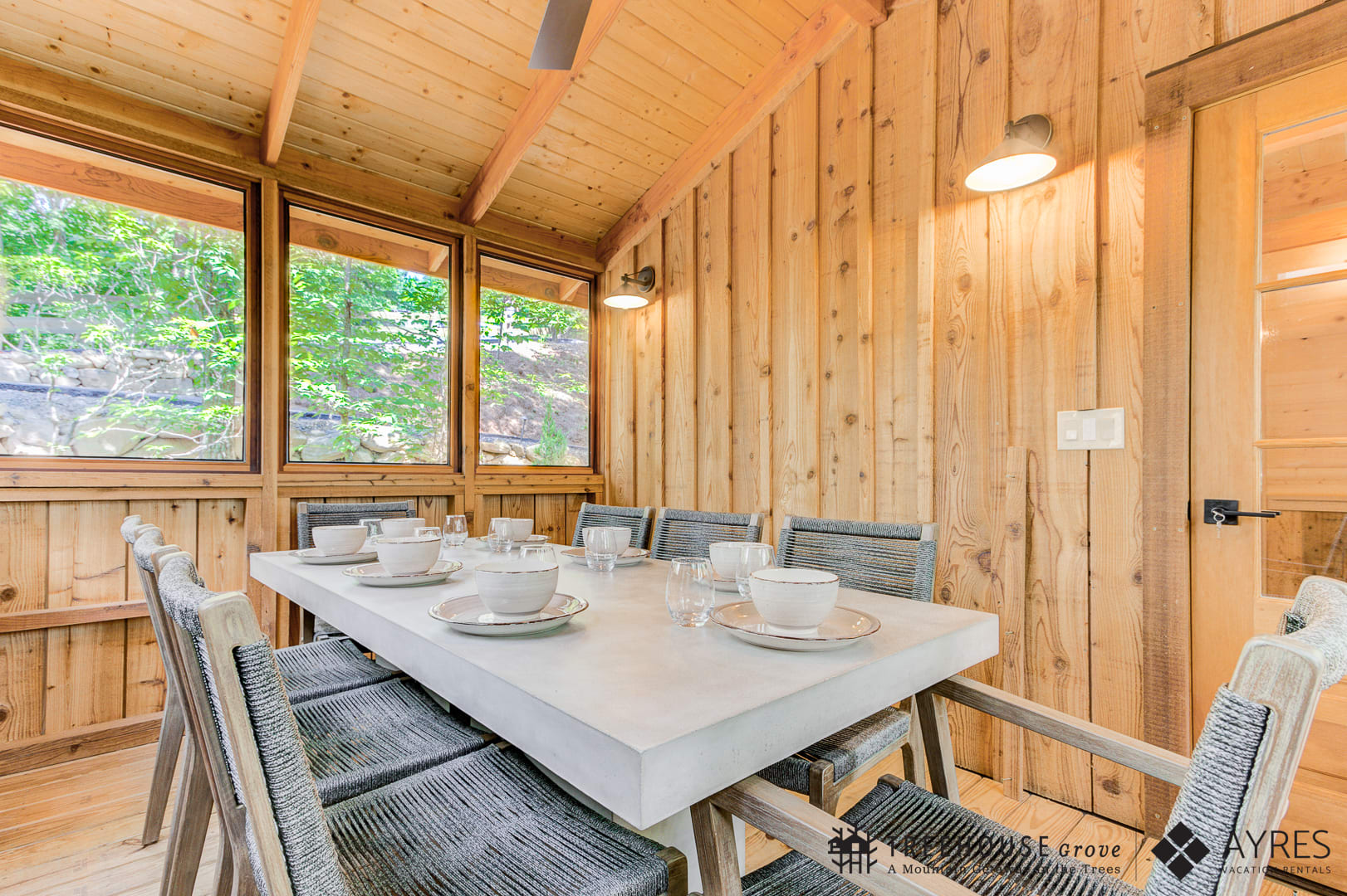 - Screened Dining Porch: Oversized deck with a screened-in dining area, seating up to 8 for shared meals with stunning views