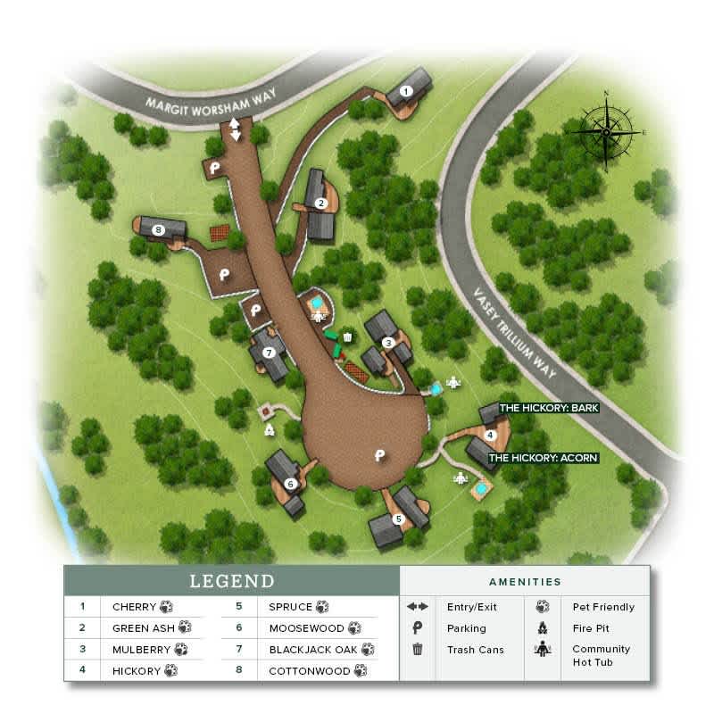 - Community Amenities: Access to shared hot tubs, grills, pizza ovens, and firepits for a well-rounded getaway.